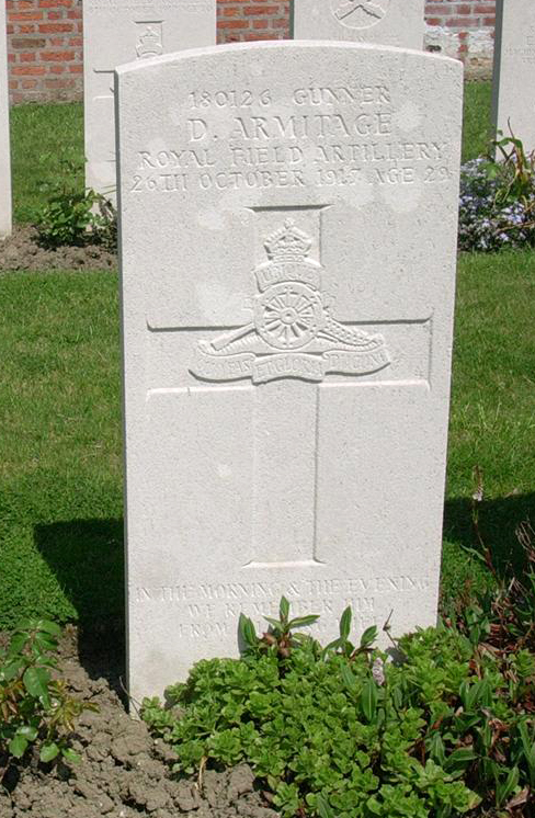 Although he was in France for the most part of a year, Dick’s luck eventually ran out, and he was killed in the Hooge Crater region around Ypres in October 1917. His parents, Briggs and Amelia Armitage (who still lived in Clayton) were informed as well as his wife, and he was laid to rest in the Hooge Crater cemetery, Belgium. His gravestone carries the inscription ‘In the morning & the evening we remember him, from a loving wife’.