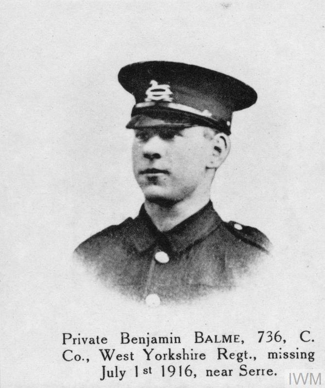 Benjamin Balme was the son of George Frederick and Annie Balme who resided at 22, Town End, and George Balme was informed as to Ben’s fate within a month of his death (Annie Balme had died a couple of years previously).