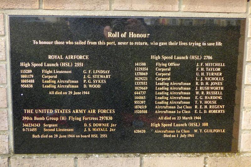 Two granite tablets placed side by side on a brick wall over looking the sea at Gorlestone-on-Sea Harbour commemorate the work of the Marine Craft Unit 1945-1958 and No. 24 Air Sea Rescue Unit 1940-1945. Royal Air Force Marine Base Gorleston.